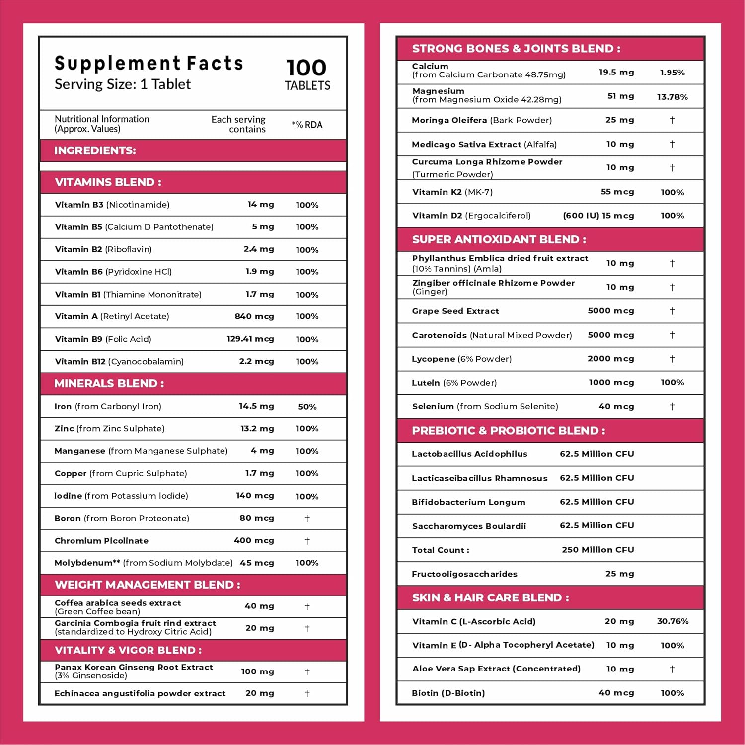 - ✅𝟏𝟎𝟎% 𝗥𝗗𝗔 𝗢𝗙 𝗠𝗨𝗟𝗧𝗜𝗩𝗜𝗧𝗔𝗠𝗜𝗡𝗦 & 𝗠𝗨𝗟𝗧𝗜 𝗠𝗜𝗡𝗘𝗥𝗔𝗟𝗦 : These women multivitamin supplement with zinc covers your complete dietary requirements by giving 100% RDA of most of the Essential Vitamins & Minerals.
