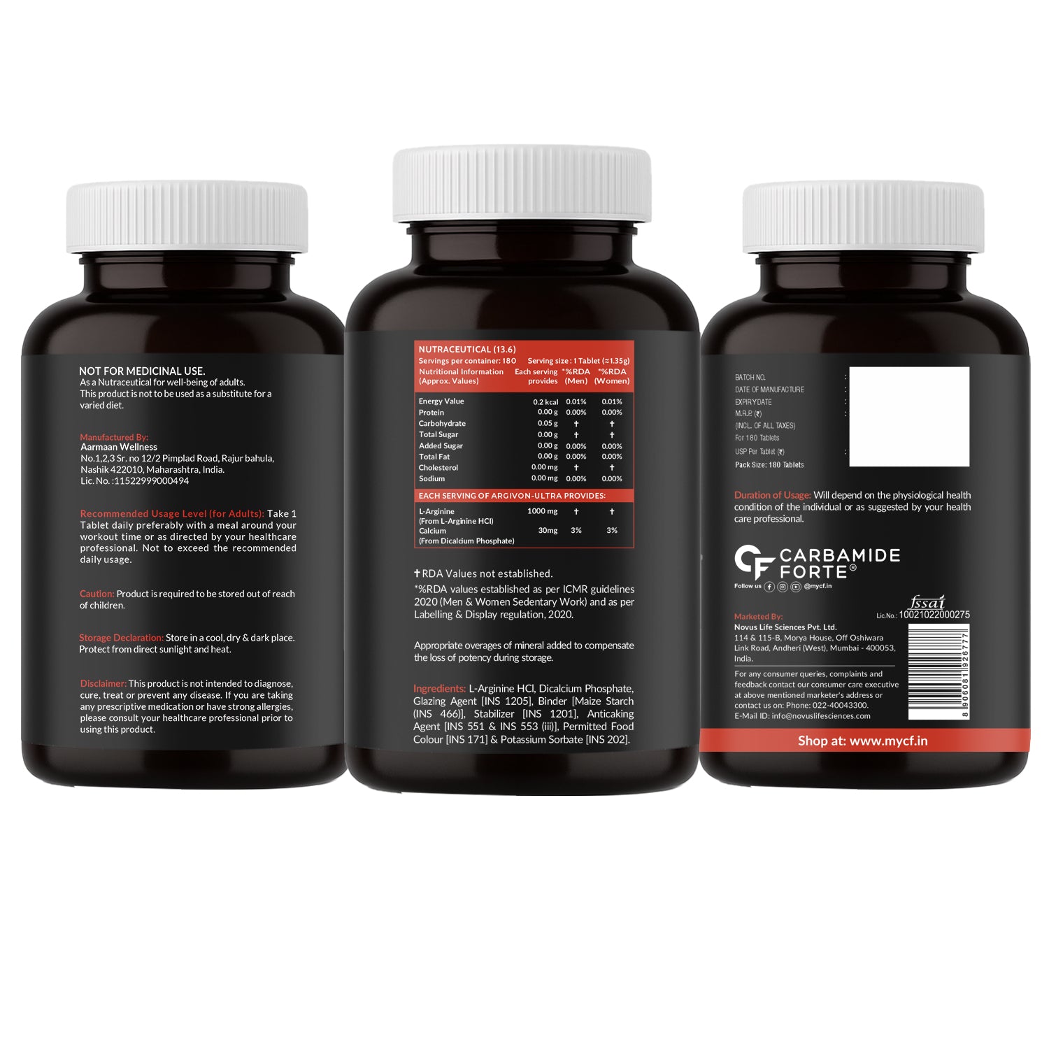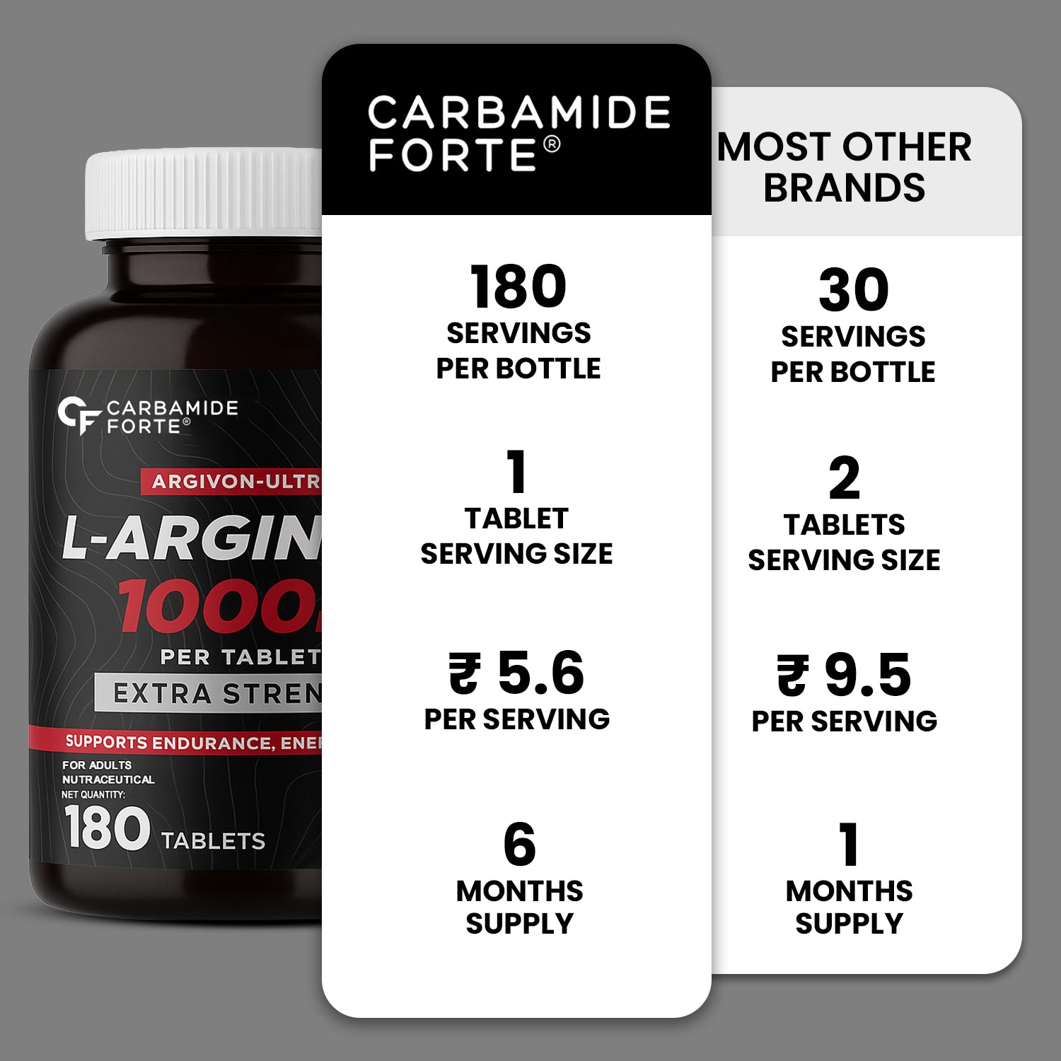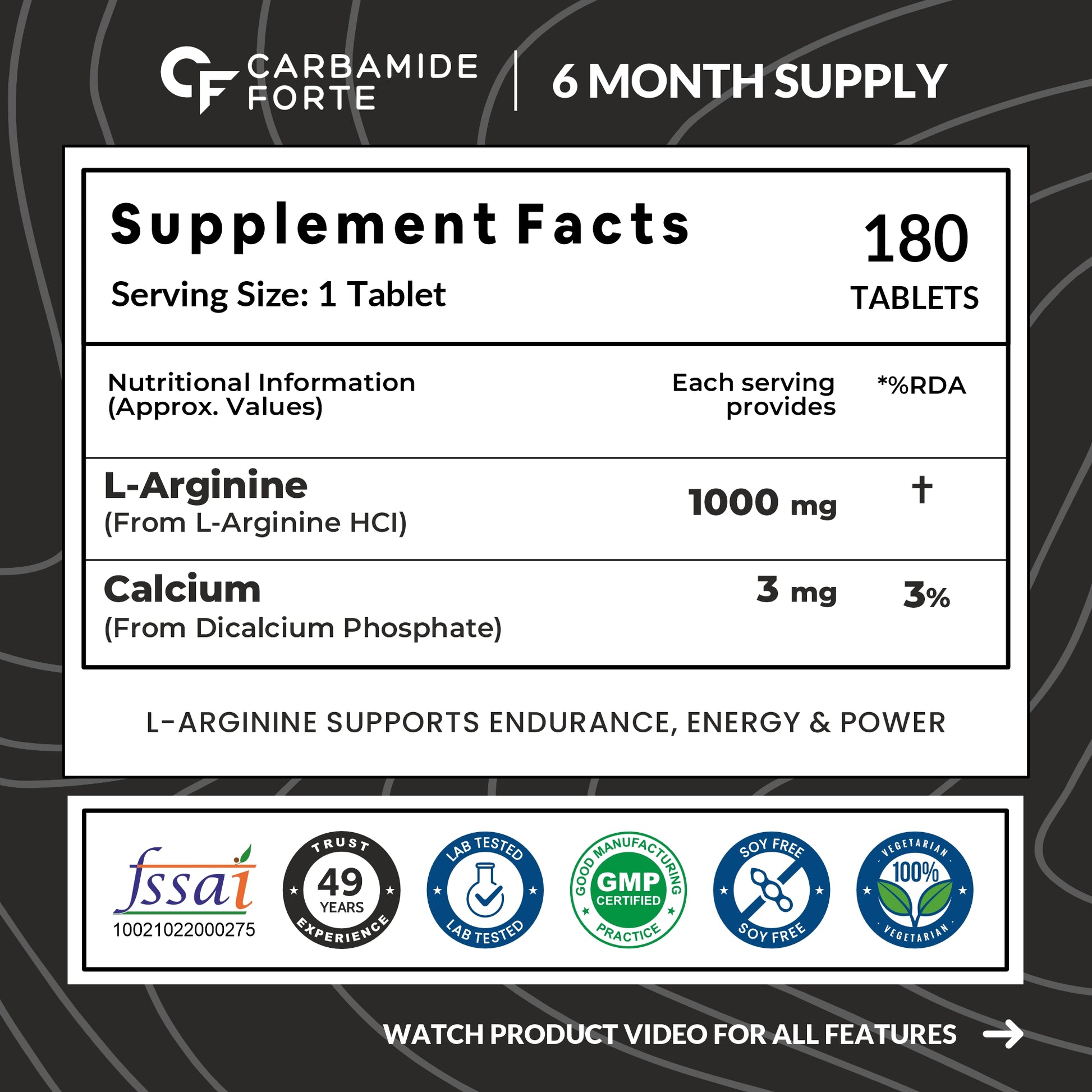 Carbamide Forte L Arginine 1000 mg | l-Arginine Supplements For Man | Boosts Nitric Oxide Production | Improved Oxygen Flow -Veg 180 Tablets