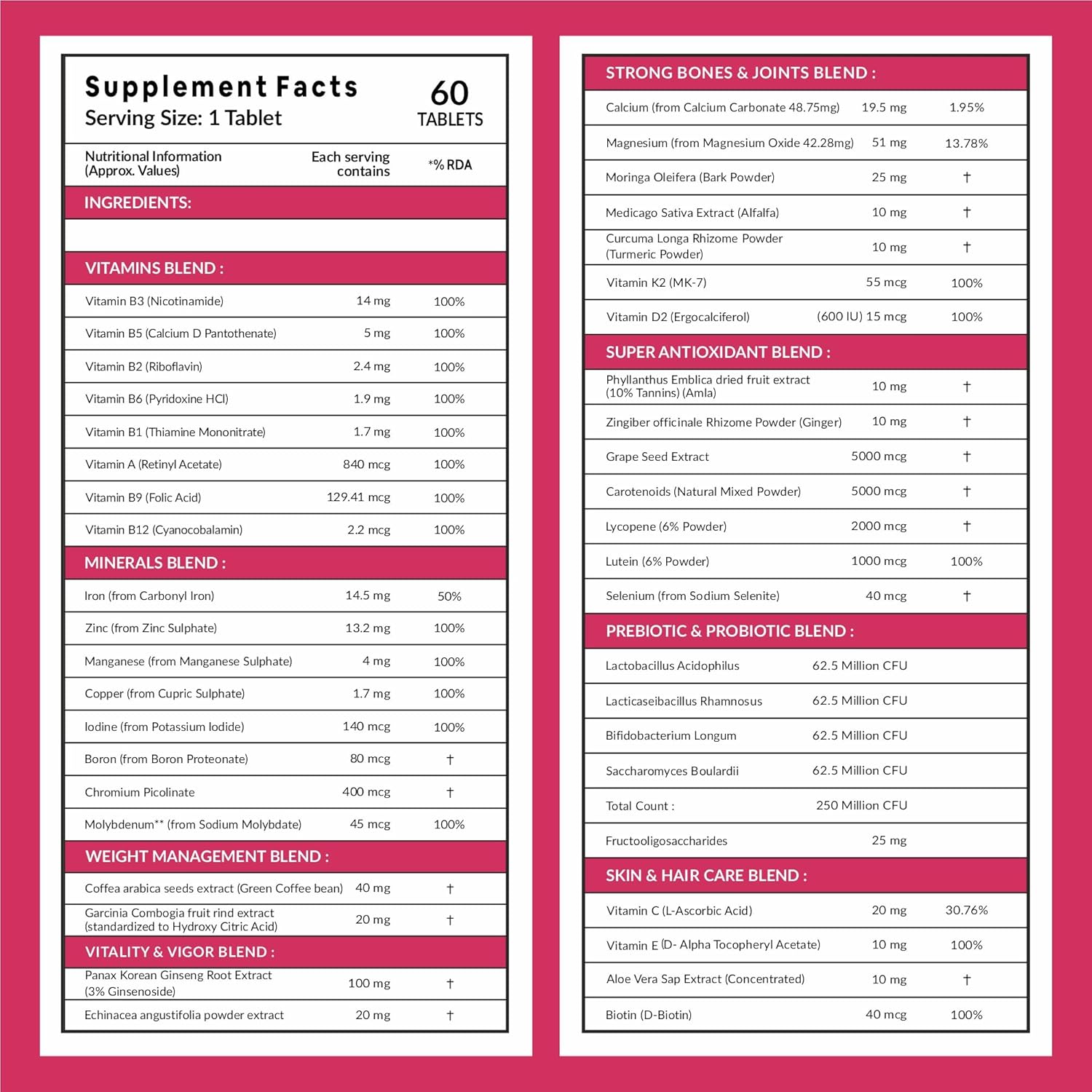 - ✅𝗠𝗨𝗟𝗧𝗜𝗩𝗜𝗧𝗔𝗠𝗜𝗡𝗦 𝗙𝗢𝗥 𝗪𝗢𝗠𝗘𝗡 𝗪𝗜𝗧𝗛 𝟖 𝗩𝗜𝗧𝗔𝗟 𝗛𝗘𝗔𝗟𝗧𝗛 𝗕𝗟𝗘𝗡𝗗𝗦 : Experience a stronger, healthier, and more energised feeling with this multivitamin tablet for women . This multivitamin women features a SUPER ANTIOXIDANT, VIGOR & VITALITY BLEND, & also may help to boost your system.