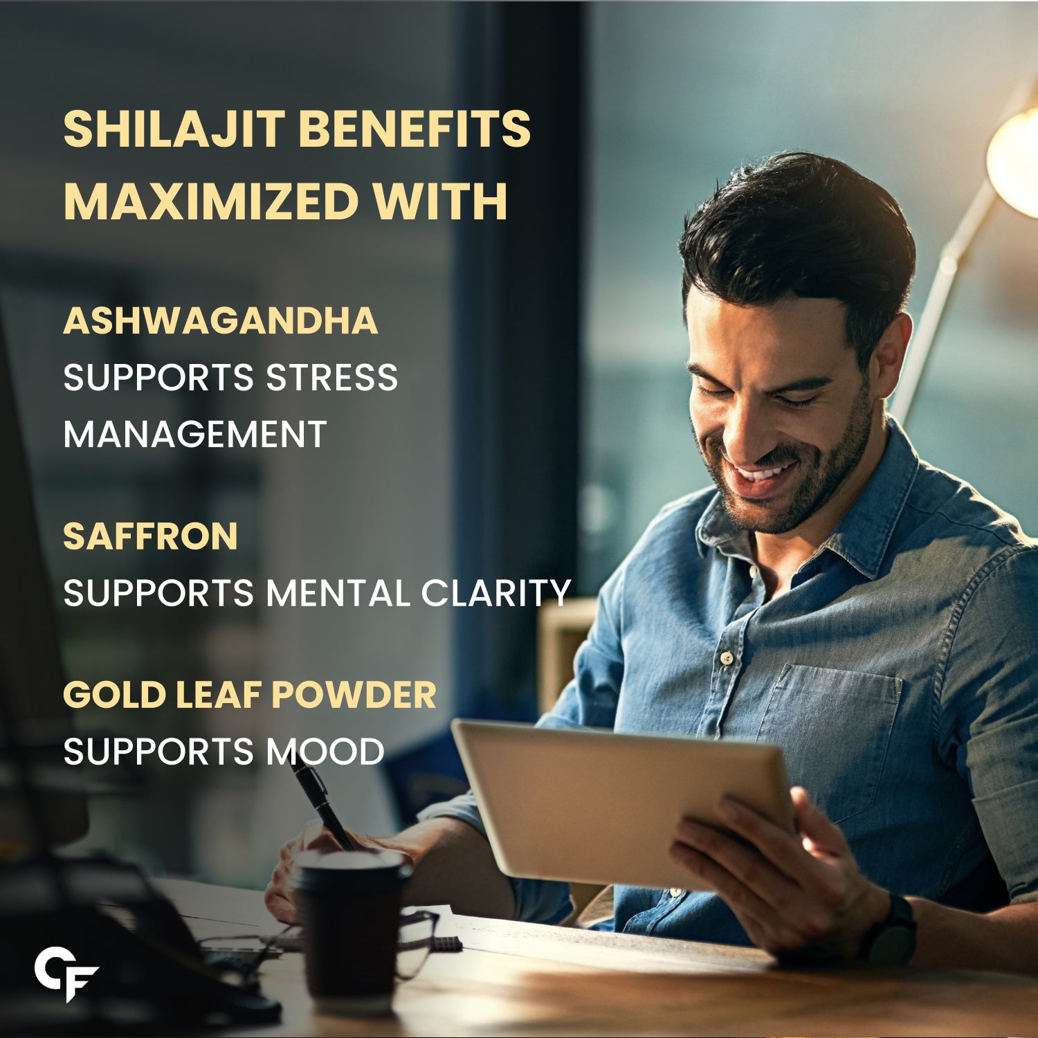 Saffron, known for its mood-enhancing properties, when combined with shilajit and Gokhru fruit extract, support stress relief and mental clarity.