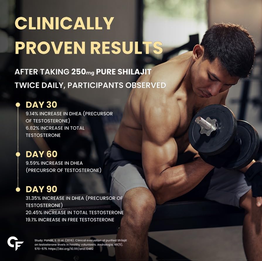 Shilajit supports cellular function and energy production while Gokhru Fruit Extract supports stamina.