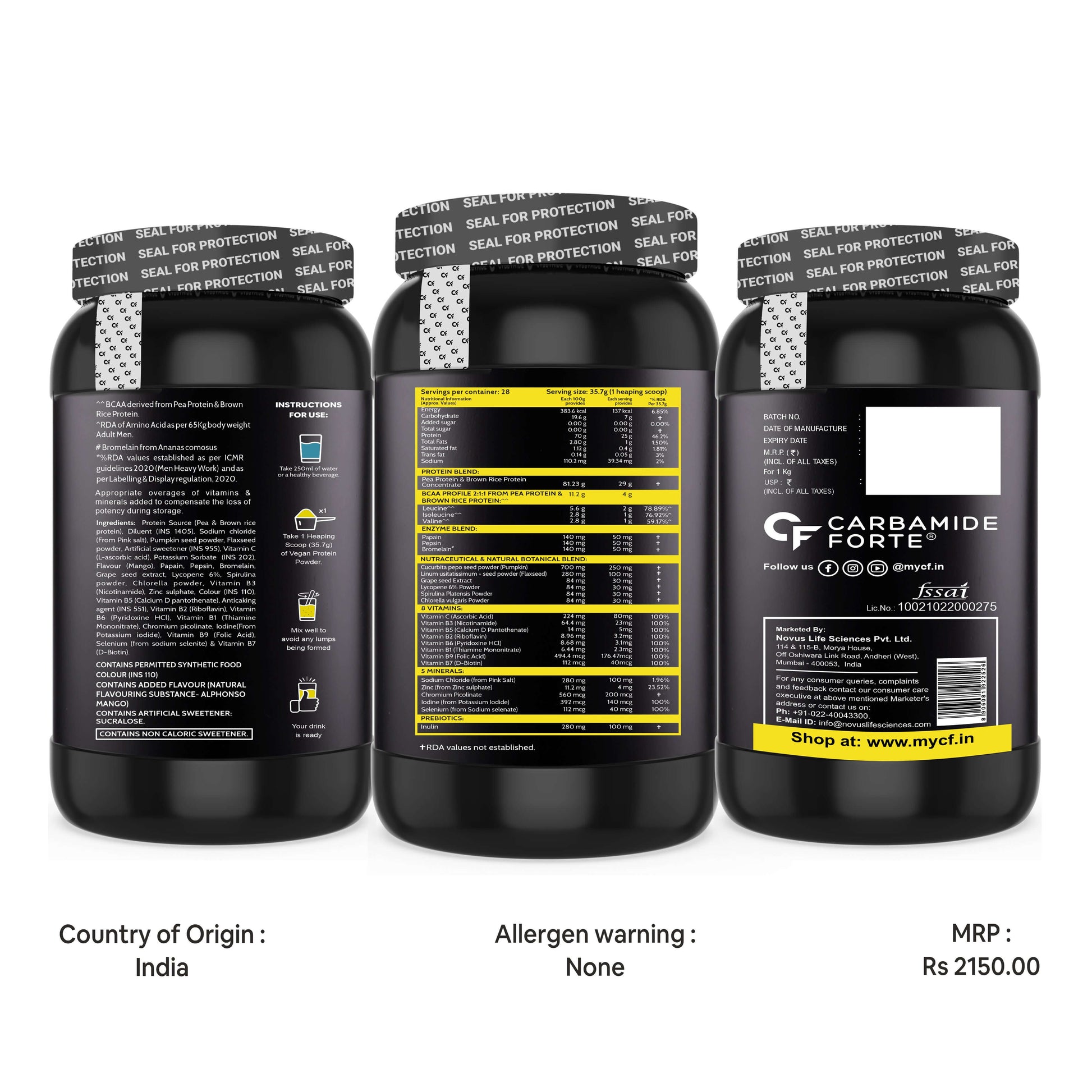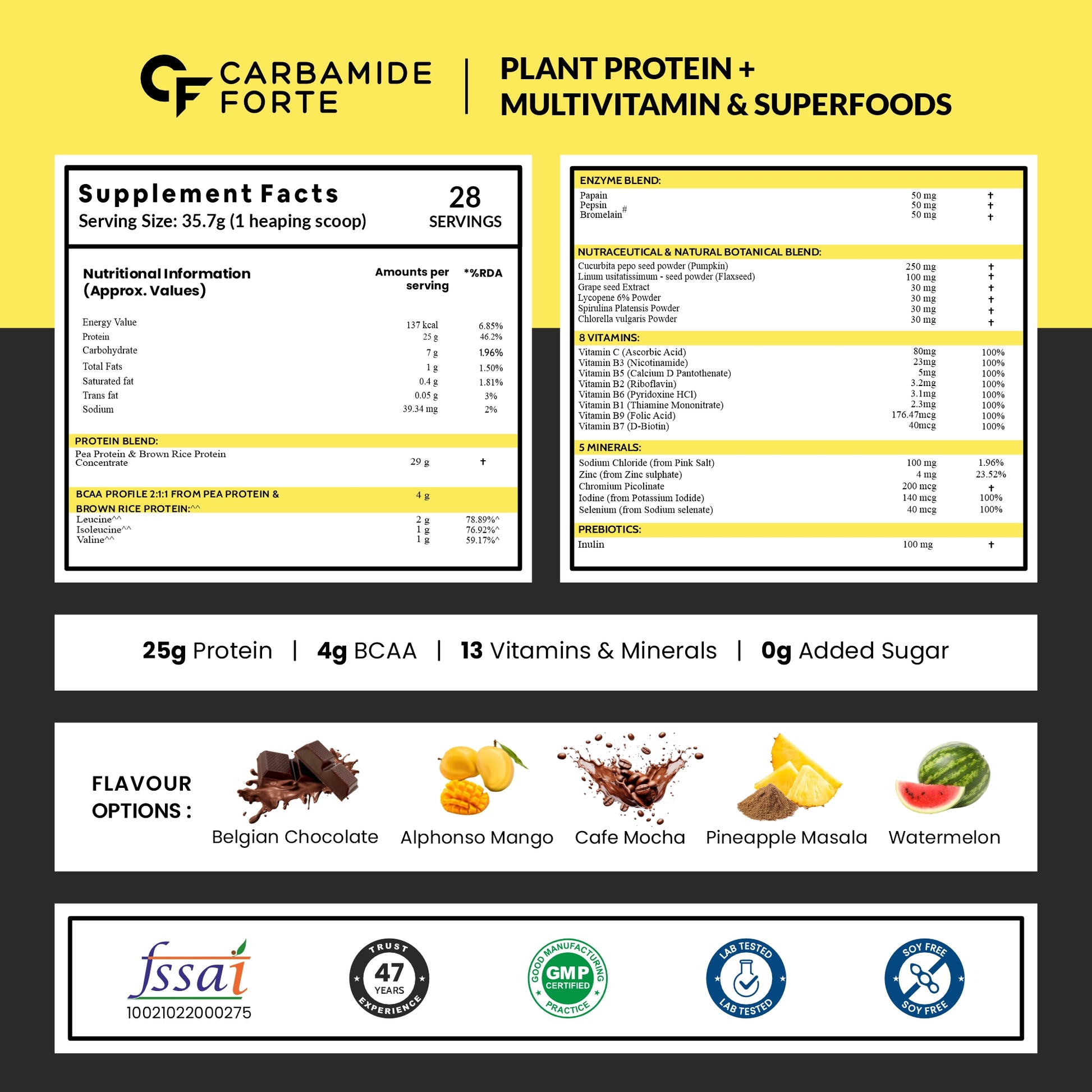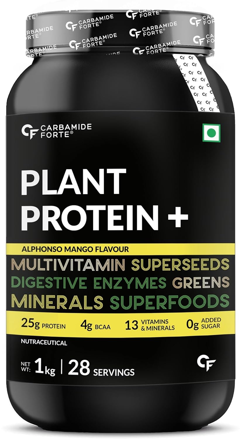 Carbamide Forte Plant Protein Powder - Plant Based Pea Protein Powder with Multivitamin, Minerals, Superfoods, Digestive Enzymes - Alphonso Mango Flavour - 1kg