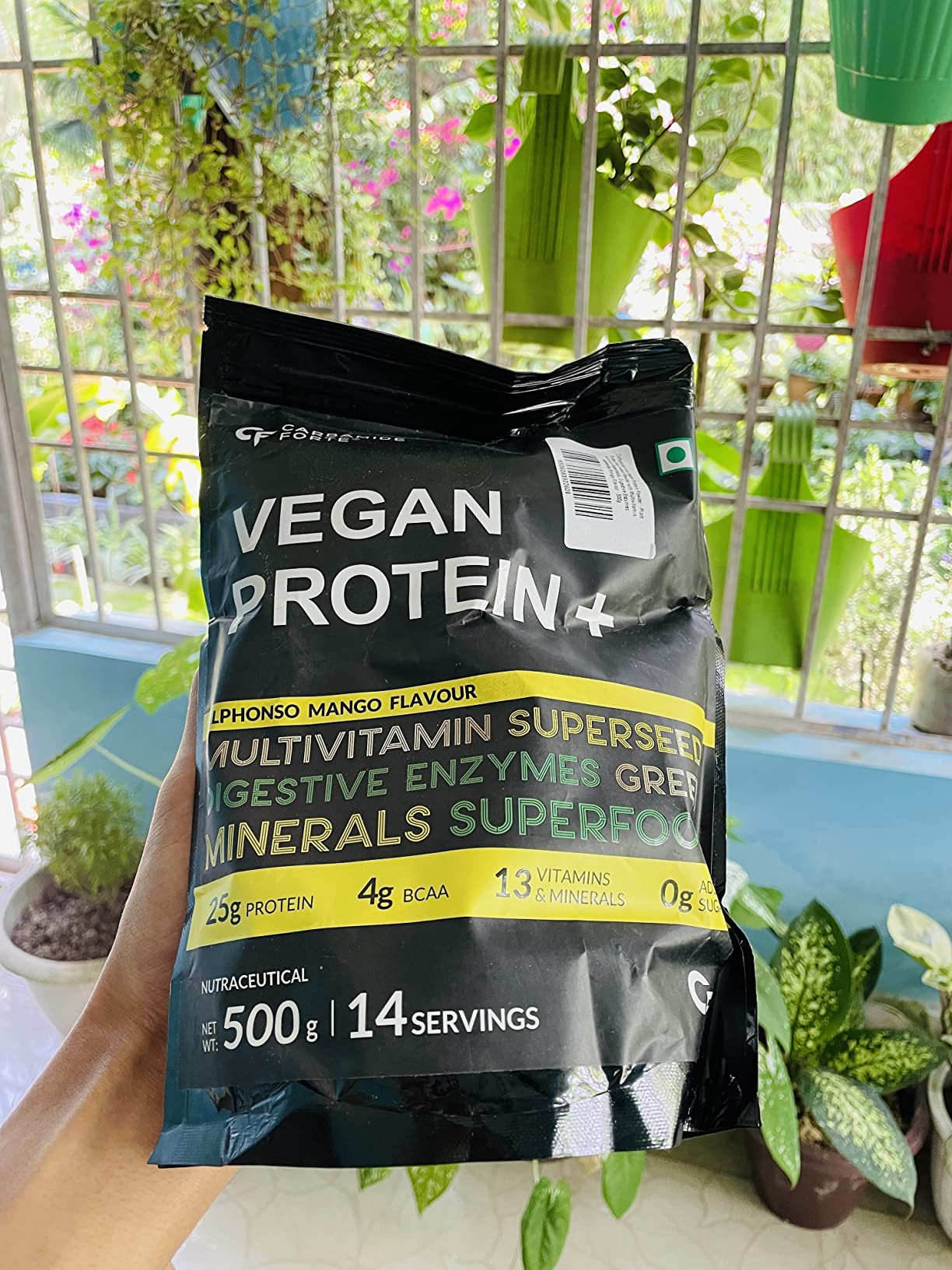 Carbamide Forte Vegan Protein Powder - Plant Based Protein Powder with Multivitamin, Minerals, Superfoods, Pea Protein, Digestive Enzymes | Plant Protein Powder - Alphonso Mango Flavour - 500g