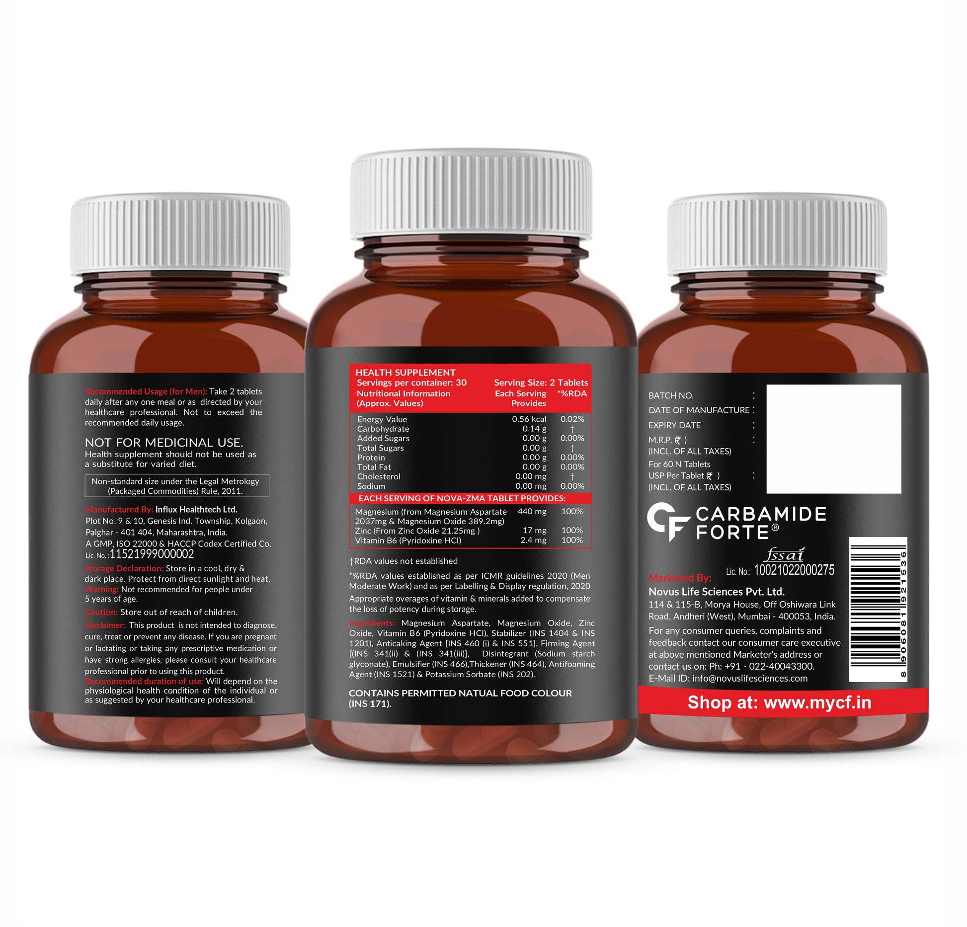Carbamide Forte ZMA Supplements for Men & Women - Zinc, Magnesium Aspartate & Vitamin B6 - Nighttime Muscle Recovery Supplements for Muscle Strength - 60 Veg Tablets
