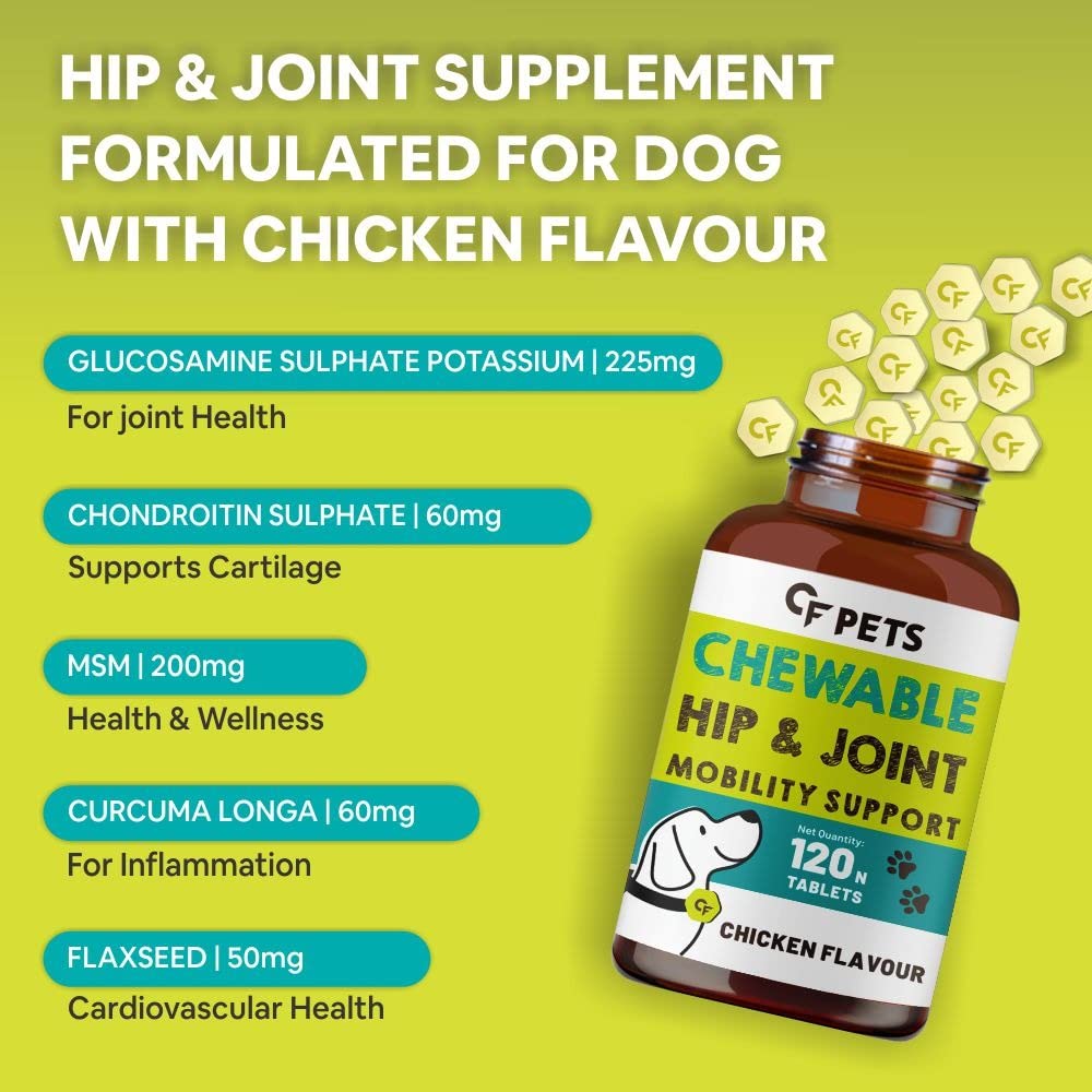 CF Pets Chewable Hip and Joint Tablet with Glucosamine, Chondroitin & MSM - Complete Mobility Support & Joint Support Supplement for Dogs, Puppy and Cats | Chicken Flavour - 120 Tablets