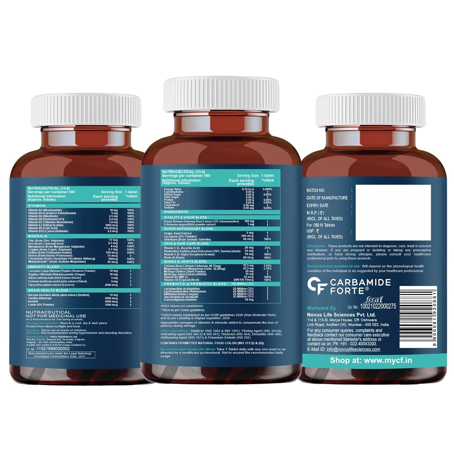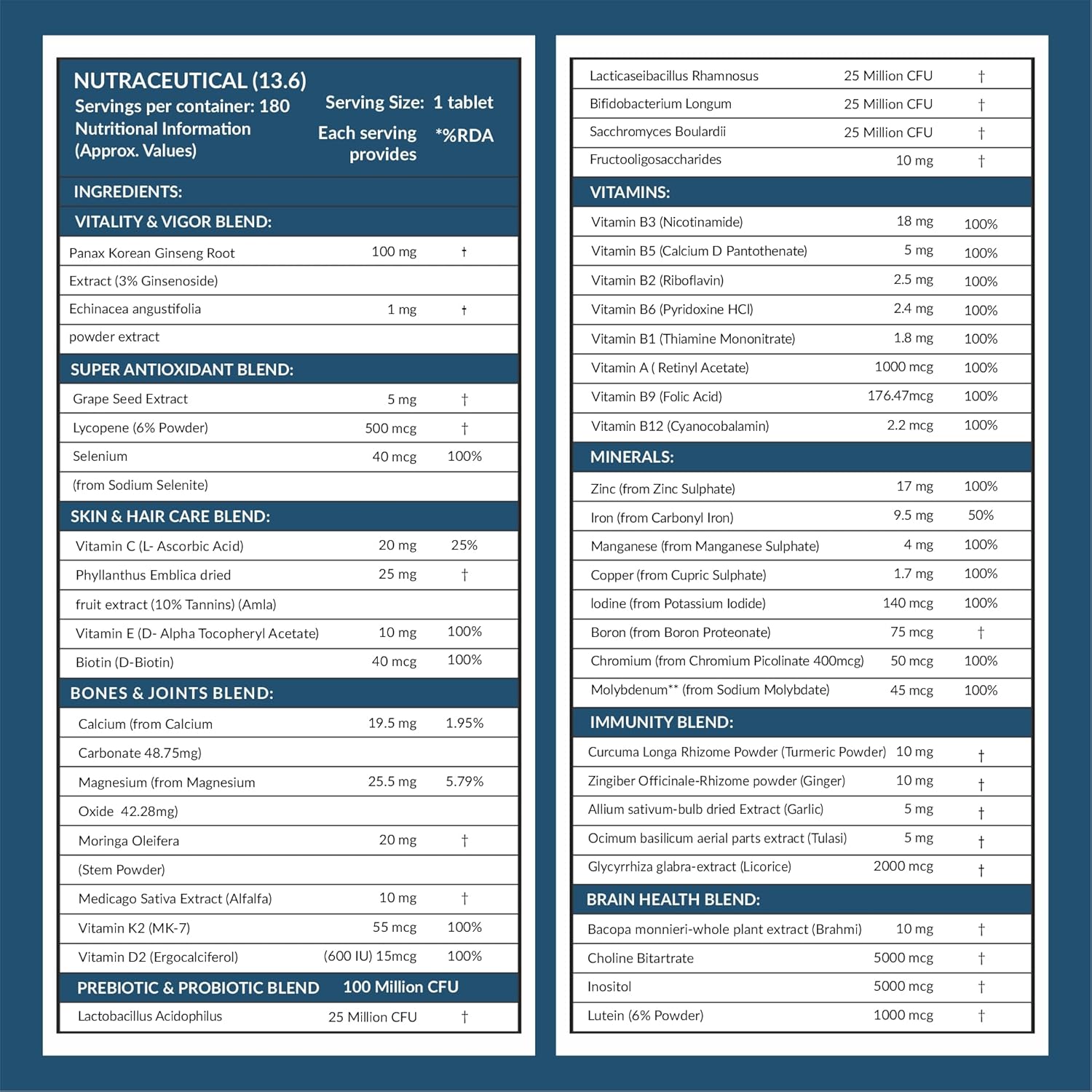 - 45 KEY INGREDIENTS IN 7 VITAL BLENDS : 100% RDA of ALL VITAMINS: Just one tablet a day gives you 45 Well Researched Ingredients in their premium form to help you achieve more from your day.100% VEGETARIAN MULTIVITAMIN TABLETS.